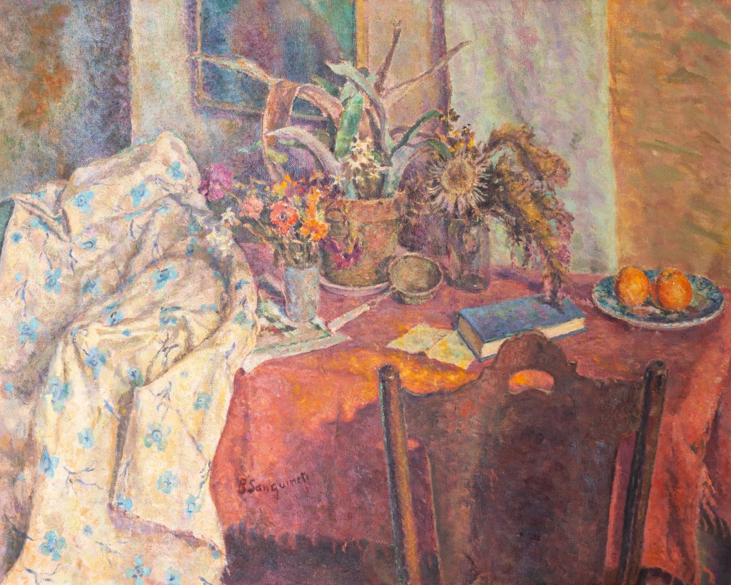 Sanguineti fu attratto nella sua orbita, al punto da stilare il manifesto e lo statuto di un’Associazione che non a caso volle chiamare Nuova Corrente, e che, purtroppo, non ebbe seguito. Sanguineti non si può definire novecentista, la sua pittura è troppo fluttuante, le sue figure vaghe, eppure qualche contatto con il Novecento traspare nel suo modo di dipingere, come ad esempio in una natura morta del ‘70, dove la tovaglia rosso arancio fa da protagonista.